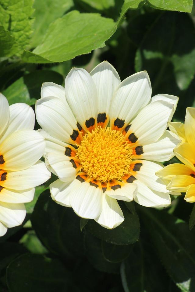 Wallpaper Three gazania flowers in green leaves on a flower bed