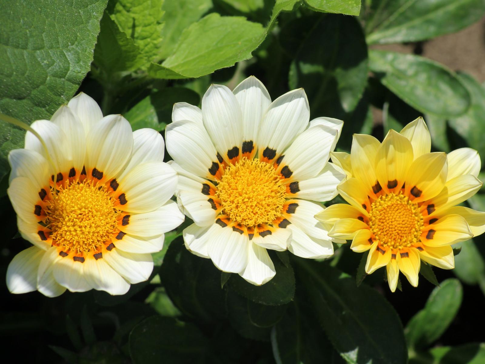 Wallpaper Three gazania flowers in green leaves on a flower bed