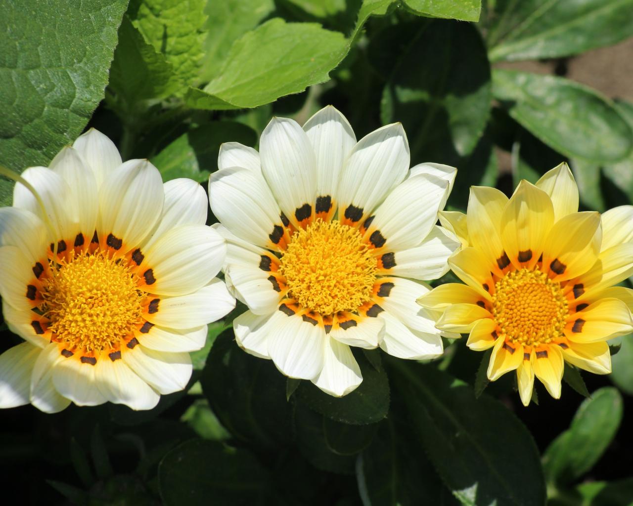 Wallpaper Three gazania flowers in green leaves on a flower bed