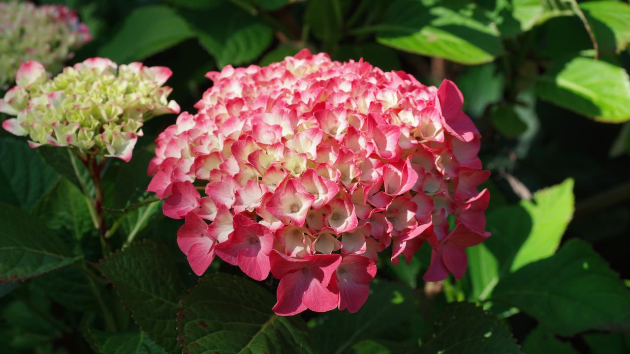 Wallpaper Pink hydrangea on a flowerbed in the sun