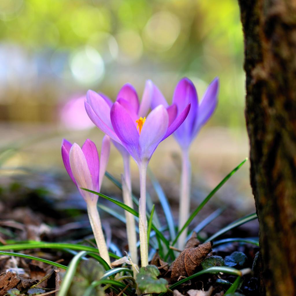 Wallpaper Beautiful delicate lilac crocuses near a tree in spring