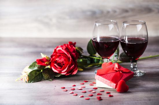 Wallpaper Roses, a gift and two glasses of wine on the table
