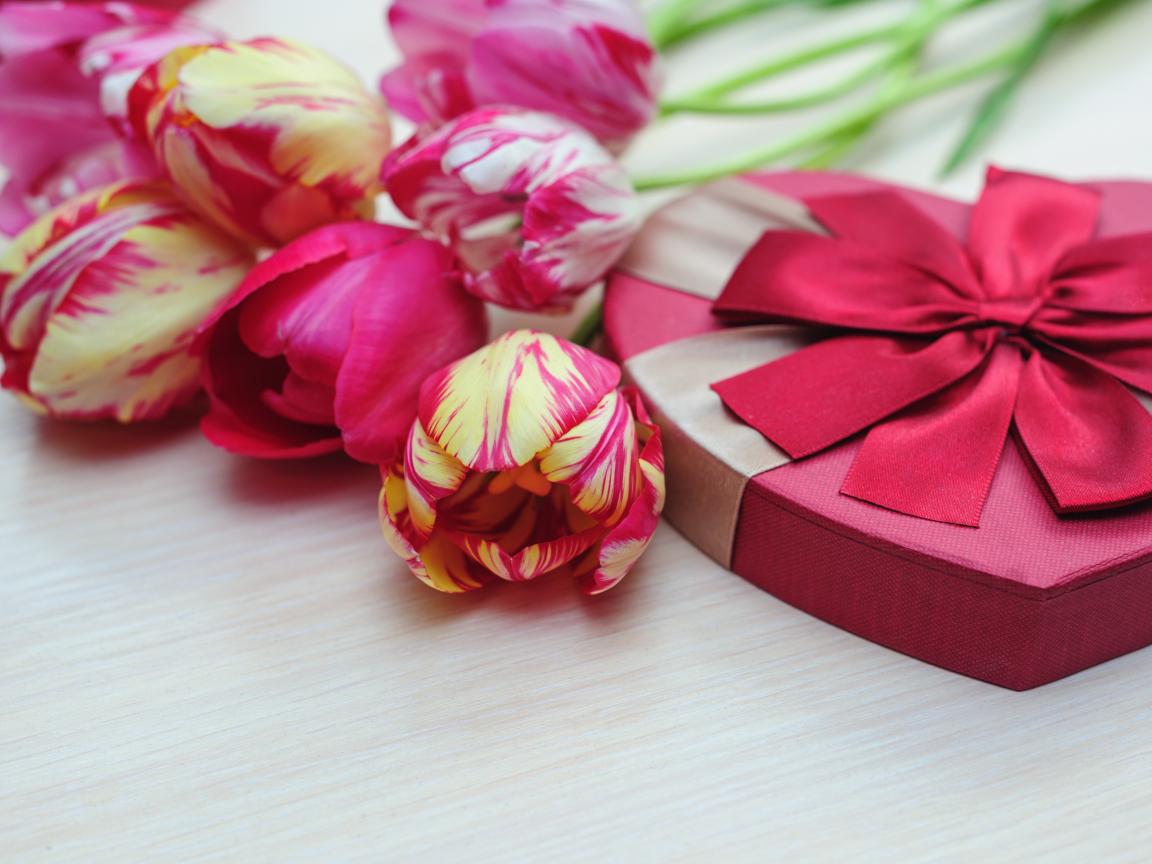 Wallpaper Heart shaped box on the table with a bouquet of tulips