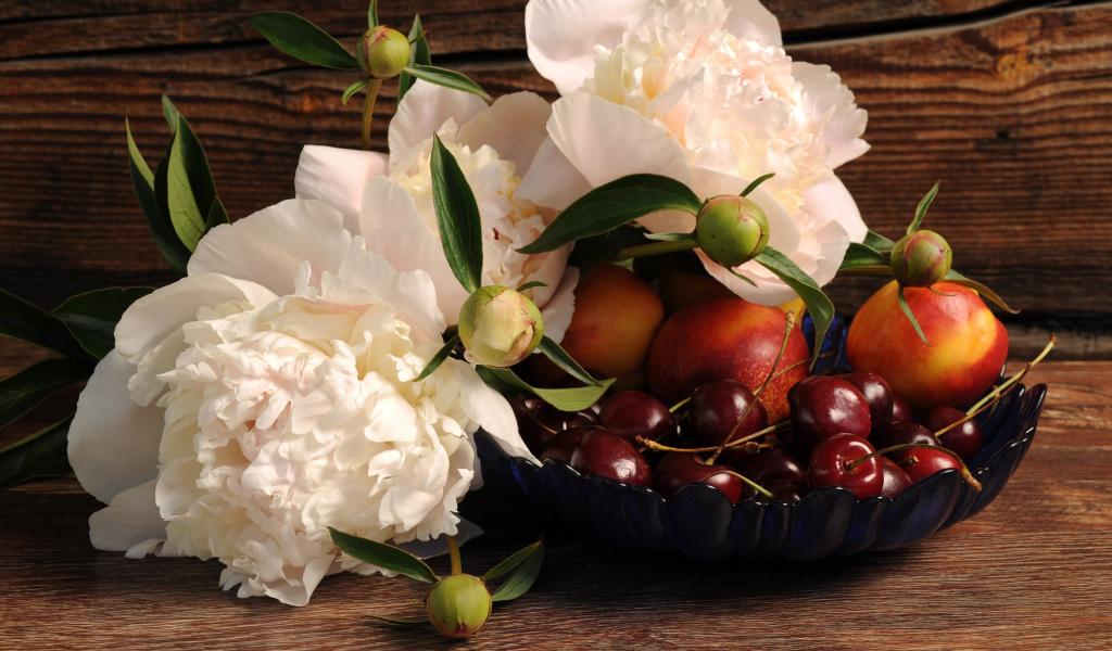 Wallpaper Bouquet of white peonies on a table with nectarine and cherry