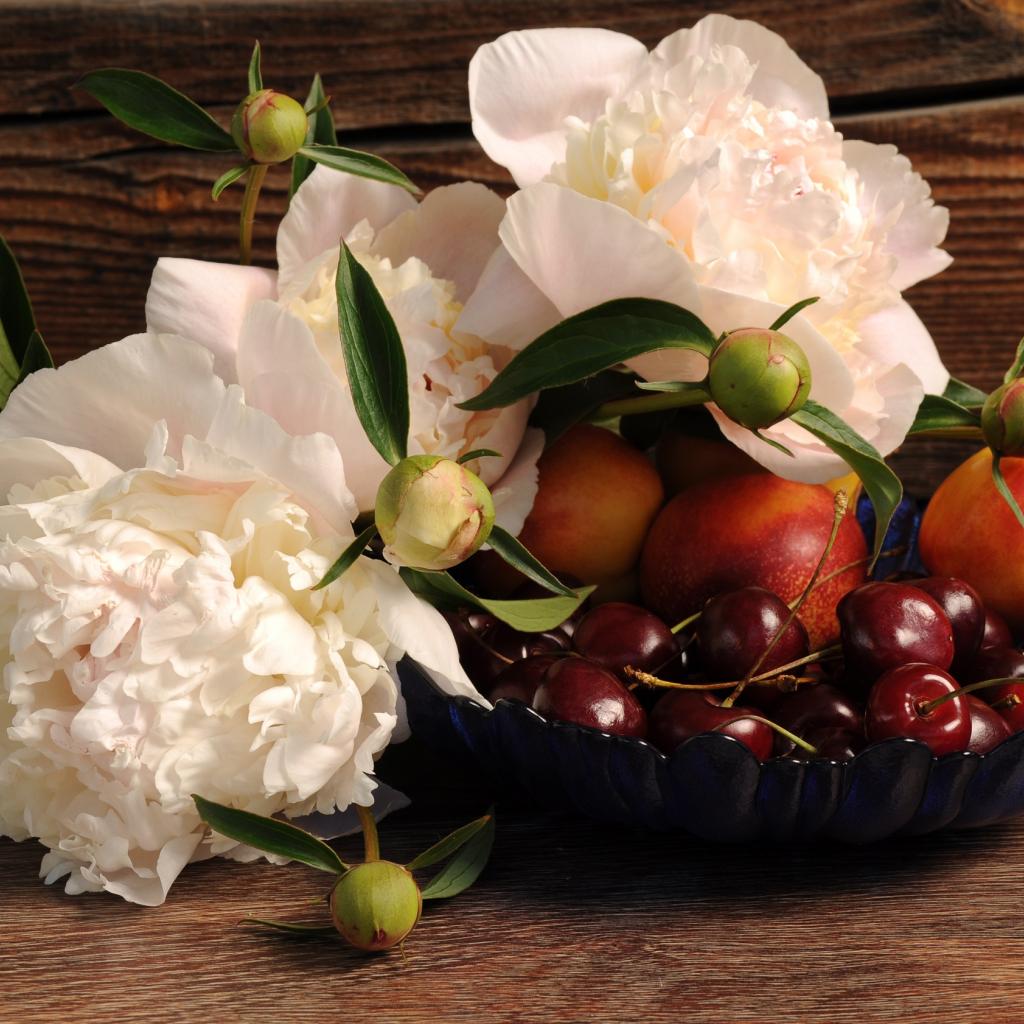 Wallpaper Bouquet of white peonies on a table with nectarine and cherry