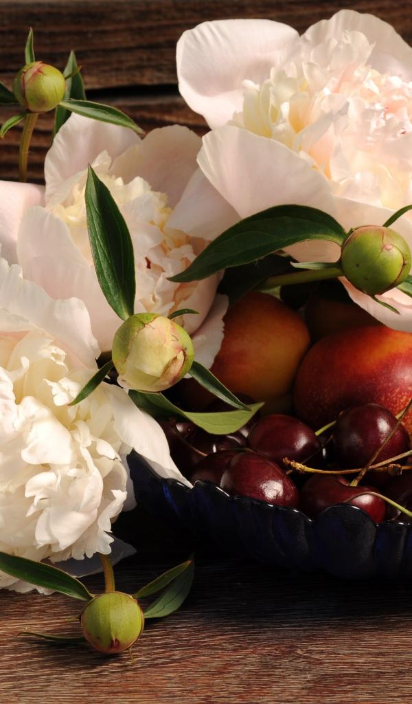 Wallpaper Bouquet of white peonies on a table with nectarine and cherry