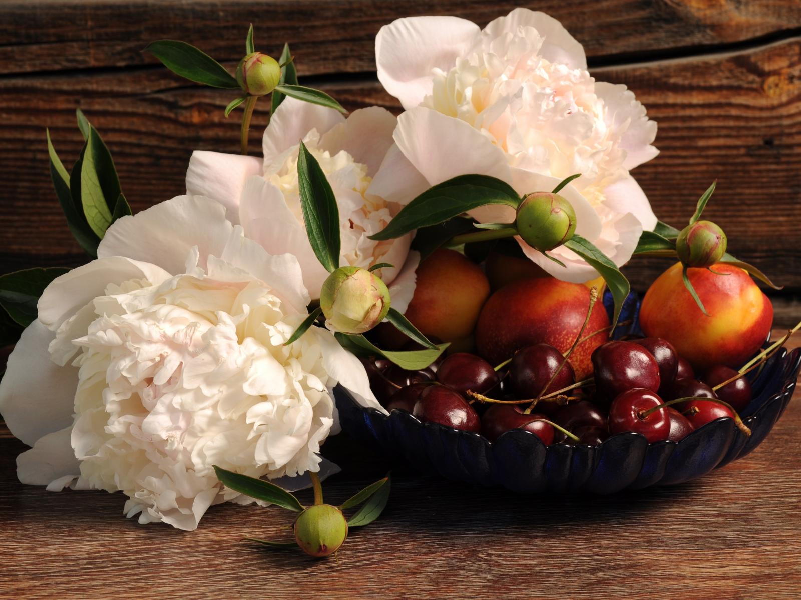 Wallpaper Bouquet of white peonies on a table with nectarine and cherry
