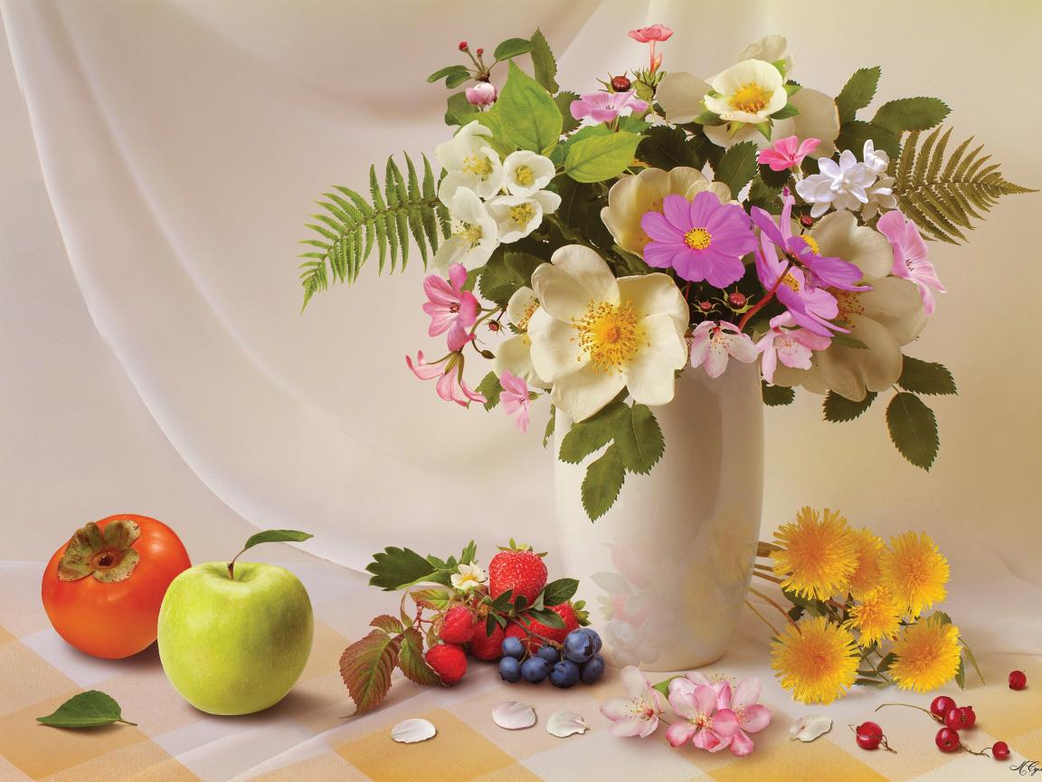 Wallpaper Bouquet in a vase on a table with fruits and berries