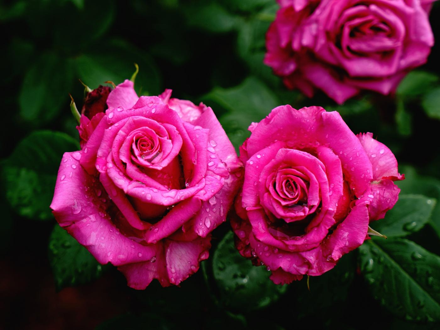 Wallpaper Beautiful pink roses in a flowerbed in dew drops