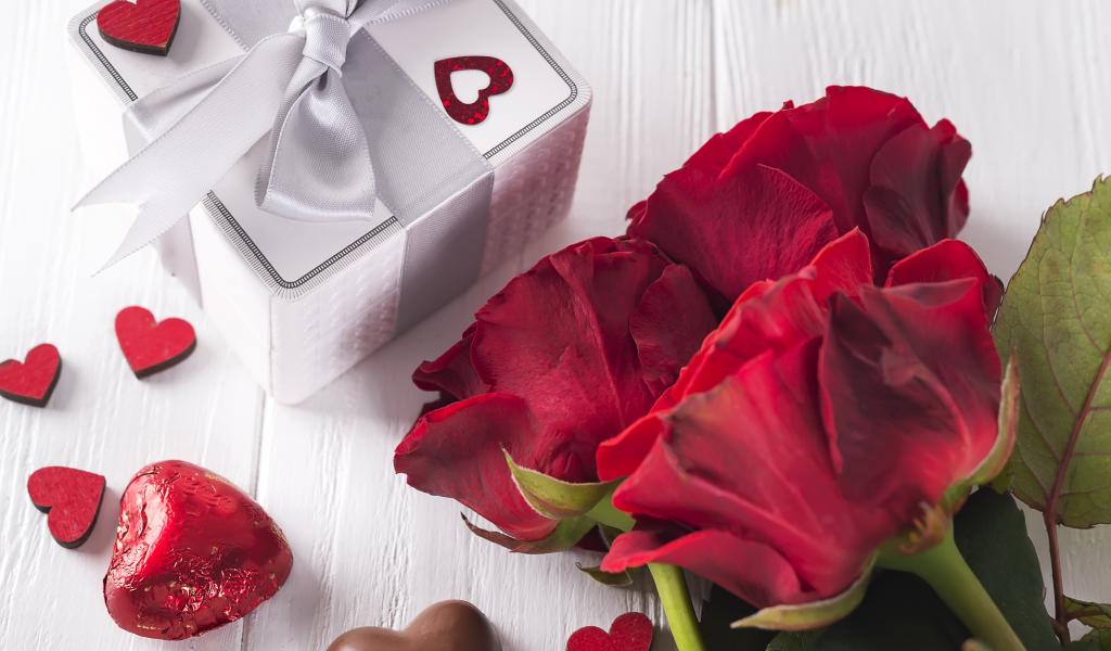 Wallpaper Bouquet of red roses on a table with sweets and a gift