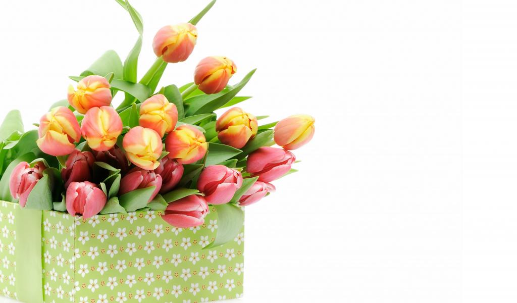 Wallpaper Bouquet of colorful tulips in a basket on a table with a notebook