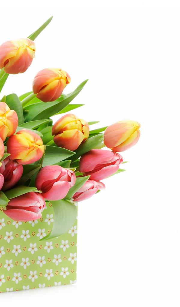 Wallpaper Bouquet of colorful tulips in a transparent vase with ribbon