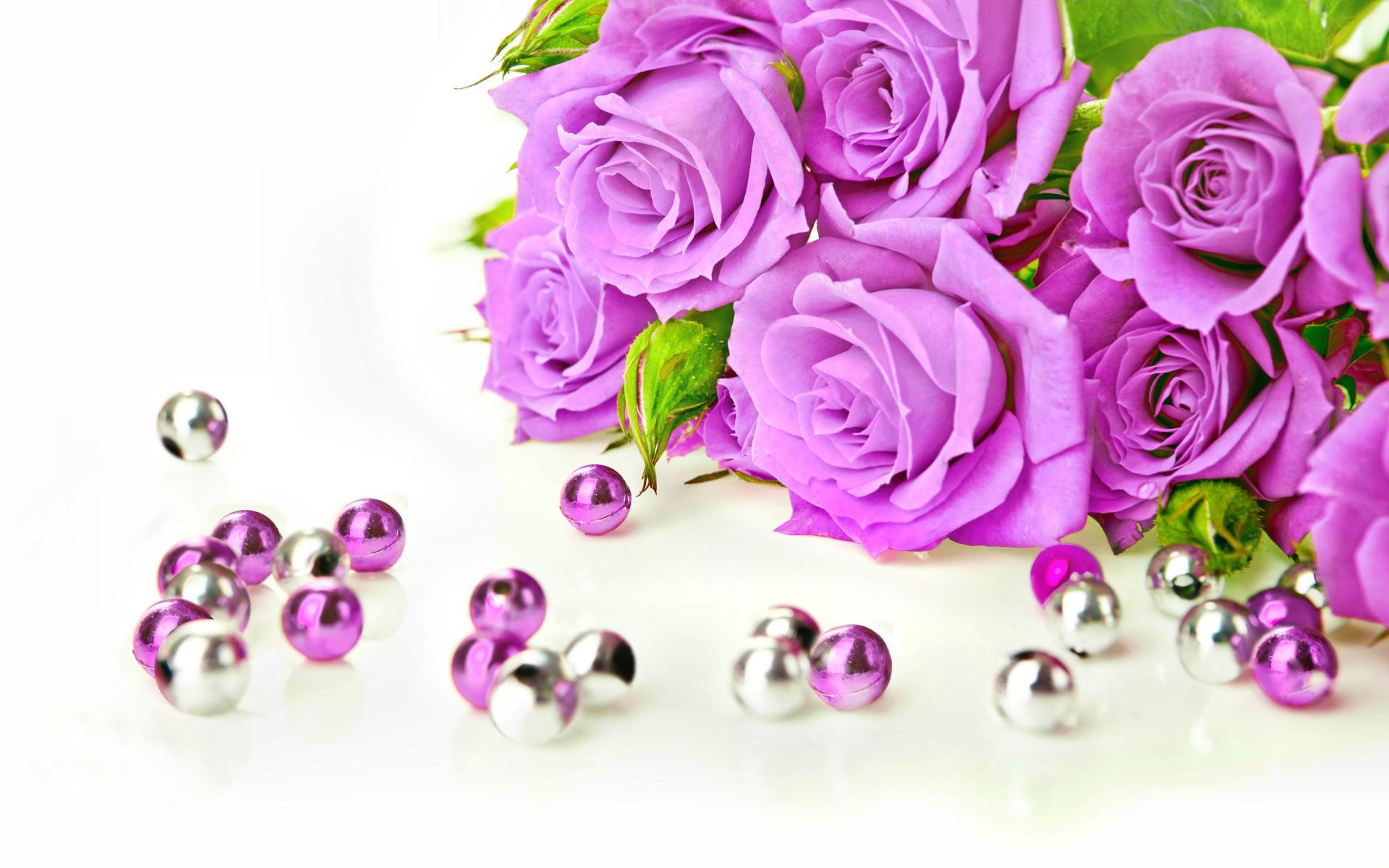 Wallpaper Beautiful lilac roses on a white background with beads