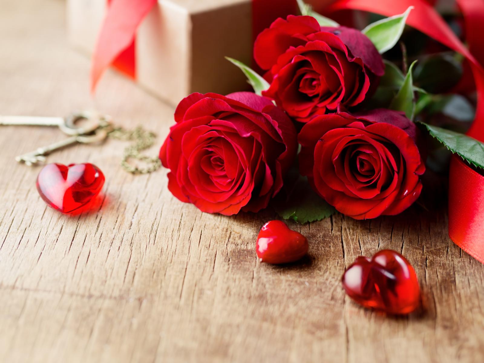 Wallpaper Three beautiful red roses on a table with hearts and keys