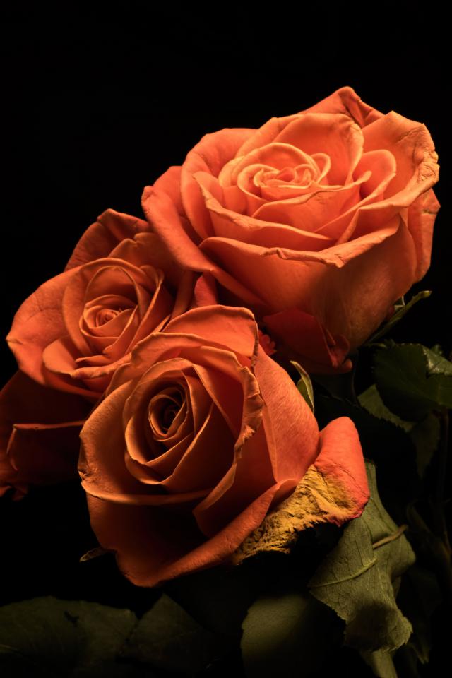 Wallpaper Three pink roses with green leaves on a black background