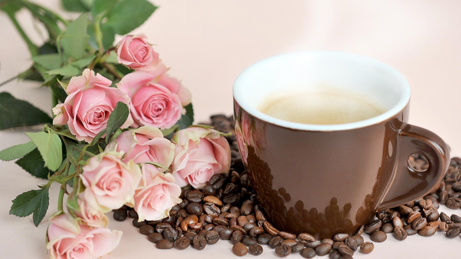 Wallpaper Bouquet of pink roses with coffee beans and a brown cup