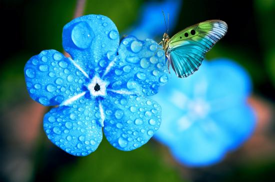 Wallpaper Blue forget-me-not flower in drops of dew with a butterfly