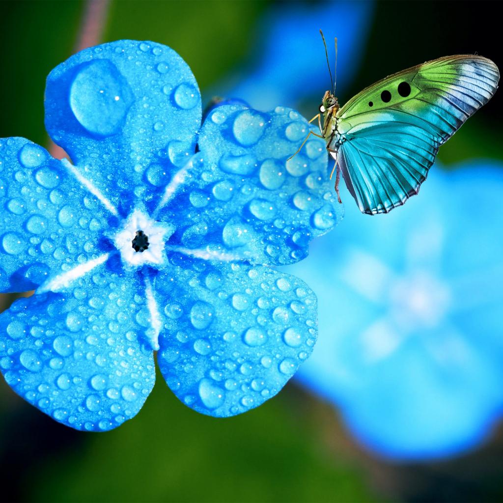 Wallpaper Blue forget-me-not flower in drops of dew with a butterfly