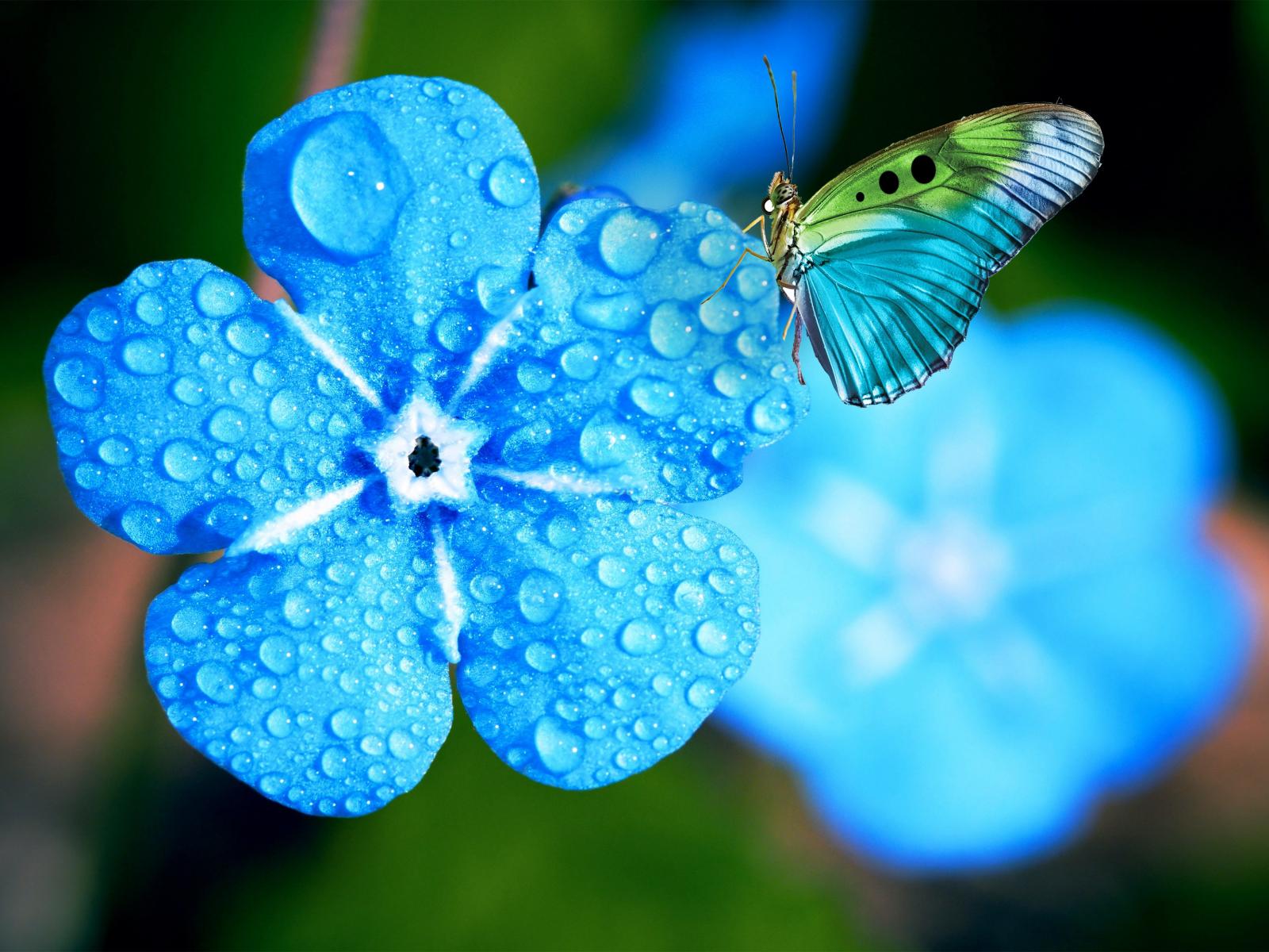 Wallpaper Blue forget-me-not flower in drops of dew with a butterfly