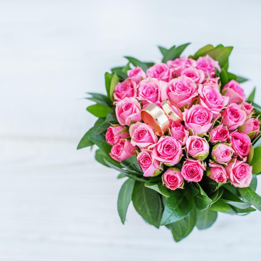 Wallpaper A large bouquet of pink roses with gold wedding rings