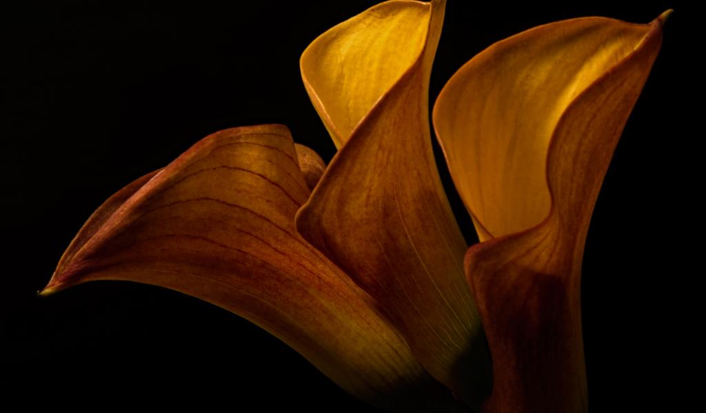 Wallpaper Orange calla flowers on a black background close-up