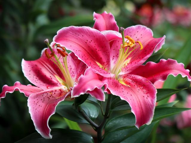 Wallpaper Pink lilies on a flower bed close-up