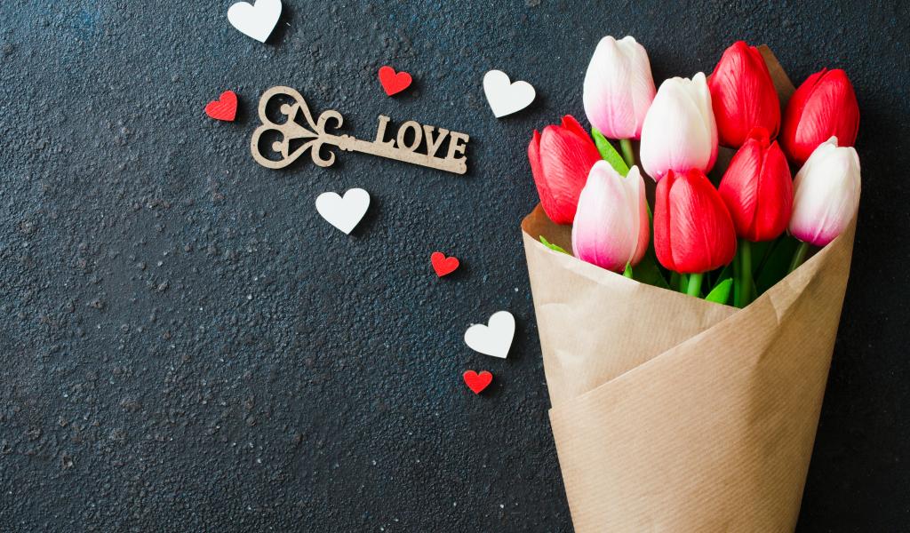 Wallpaper Bouquet of tulips in paper on a black background with a key