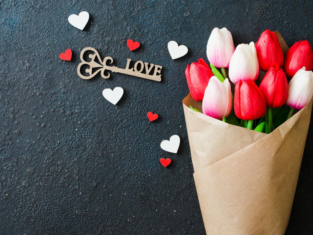 Wallpaper Bouquet of tulips in paper on a black background with a key