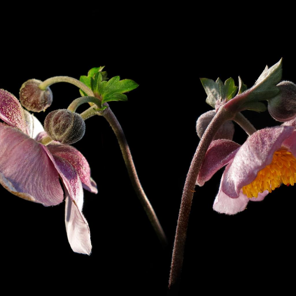 Wallpaper Pink anemone flowers with buds on a black background