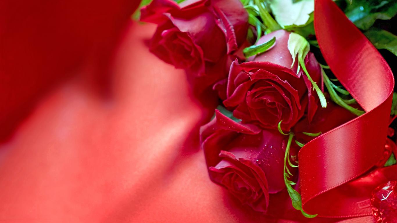 Wallpaper Three red roses with satin ribbon on a red cloth