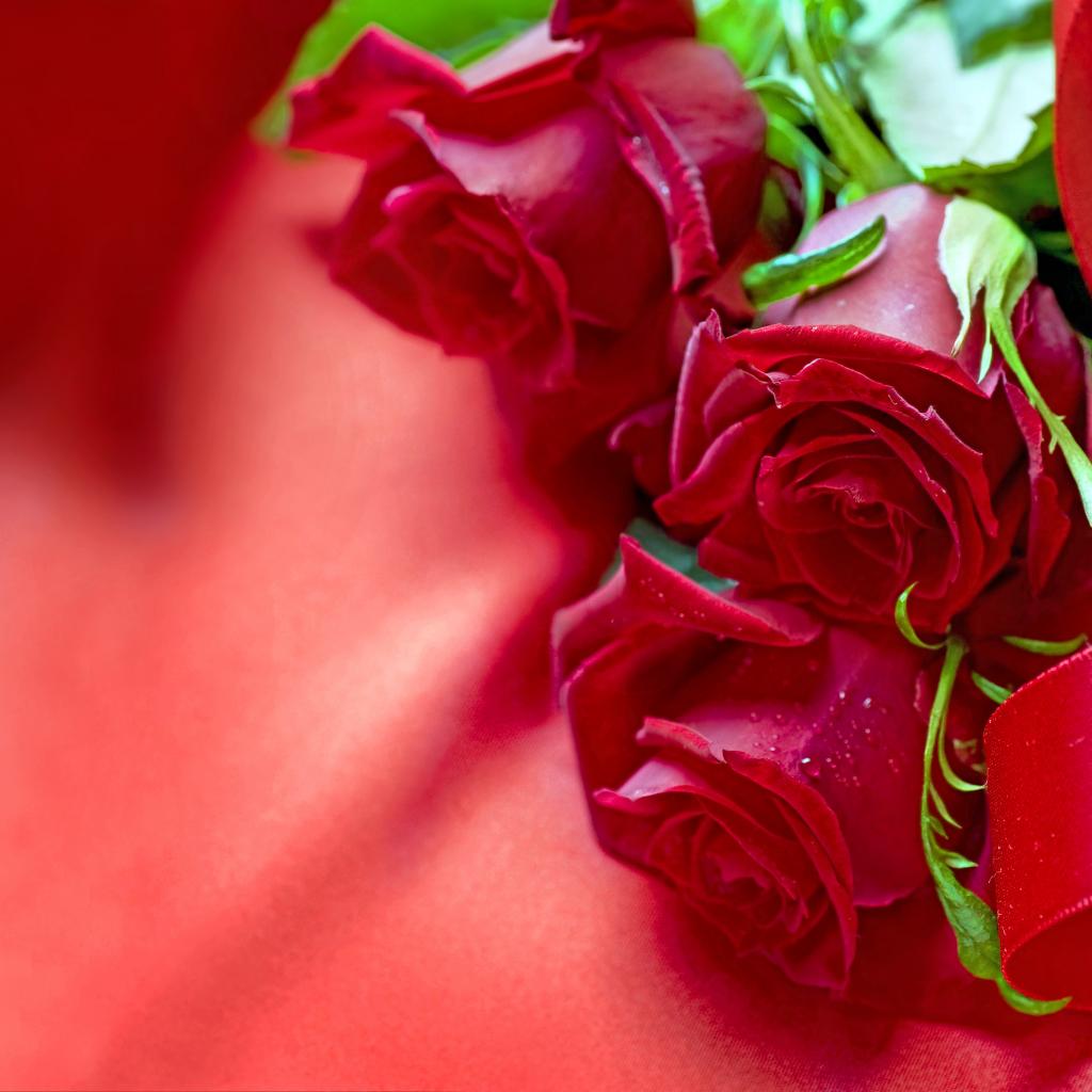Wallpaper Three red roses with satin ribbon on a red cloth