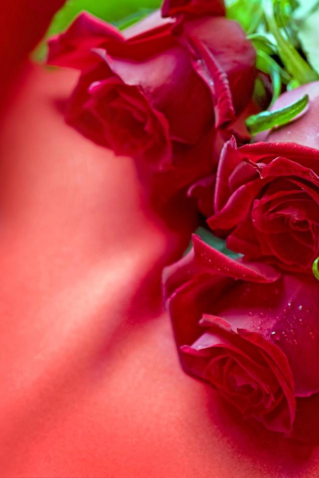 Wallpaper Three red roses with satin ribbon on a red cloth
