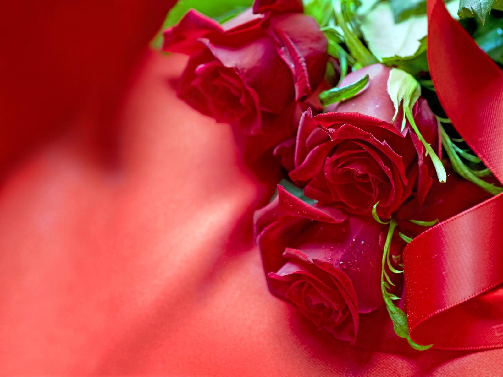 Wallpaper Three red roses with satin ribbon on a red cloth