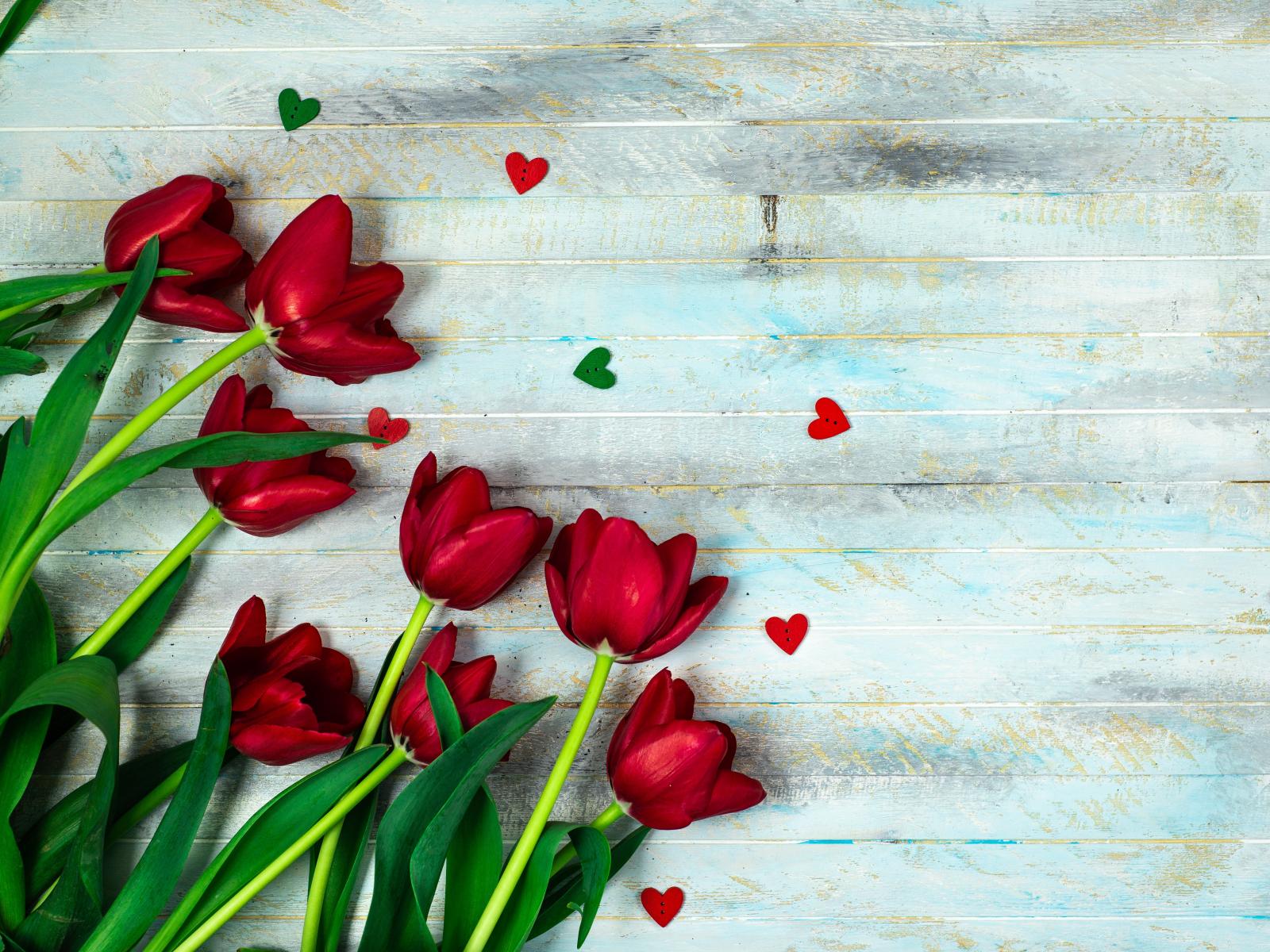 Wallpaper Bouquet of red tulips on a wooden table