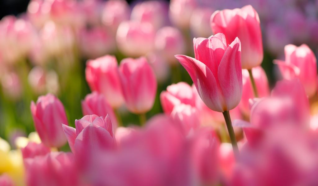 Wallpaper Pink tulips in the sun on a flower bed
