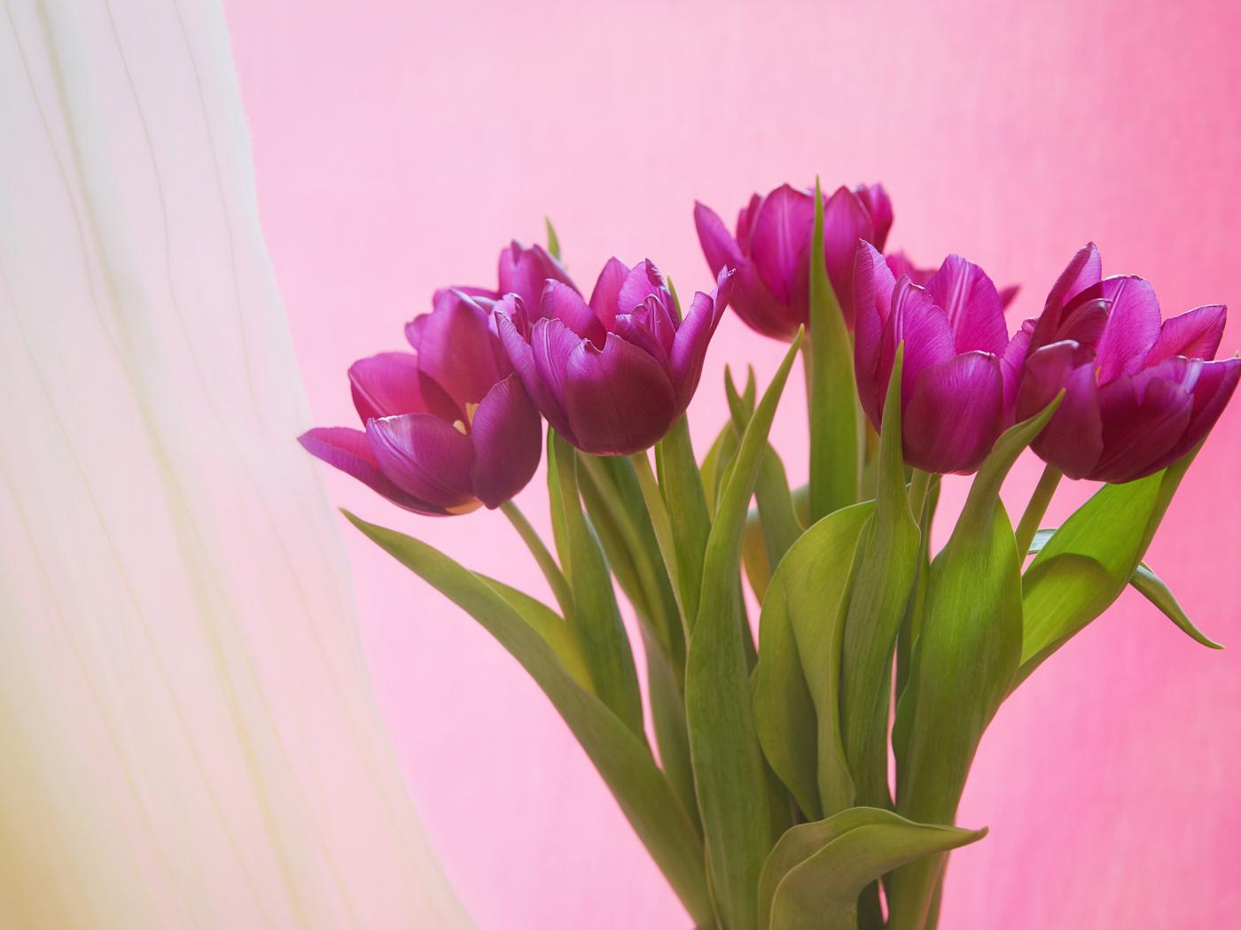Wallpaper Bouquet of lilac tulips on a pink background