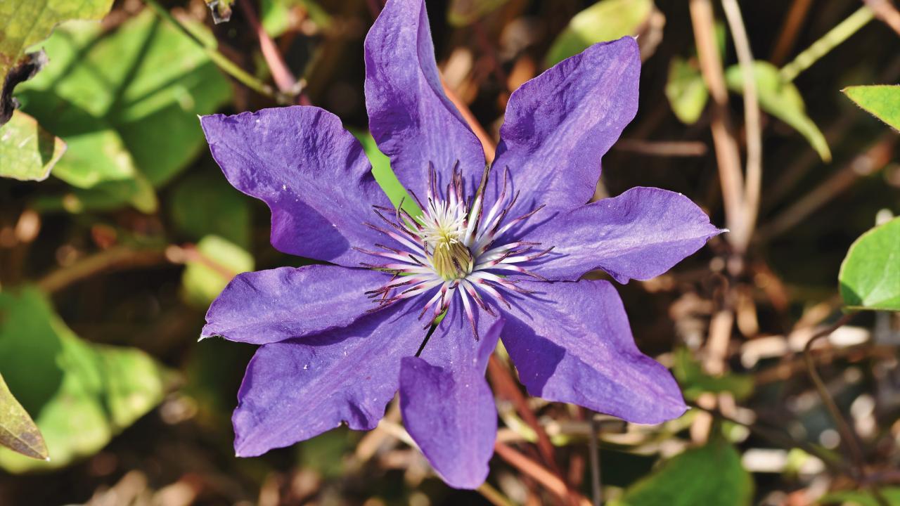 Wallpaper Big beautiful lilac clematis flower in green leaves