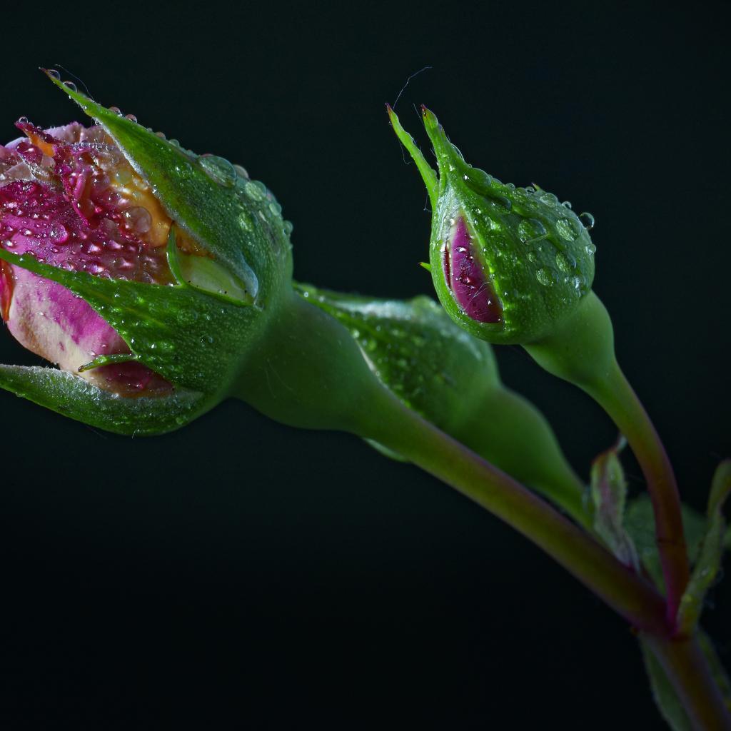 Wallpaper Rose buds in drops of water on a black background