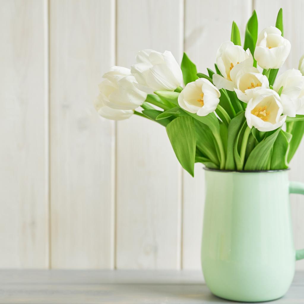 Wallpaper Bouquet of white tulips in a vase on a white background