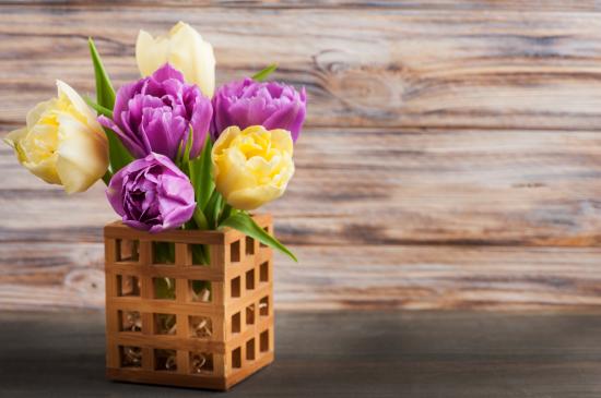 Wallpaper Bouquet of yellow and lilac tulips in a vase
