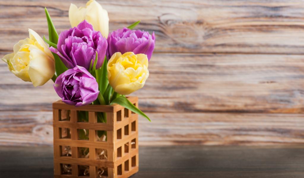 Wallpaper Bouquet of yellow and lilac tulips in a vase