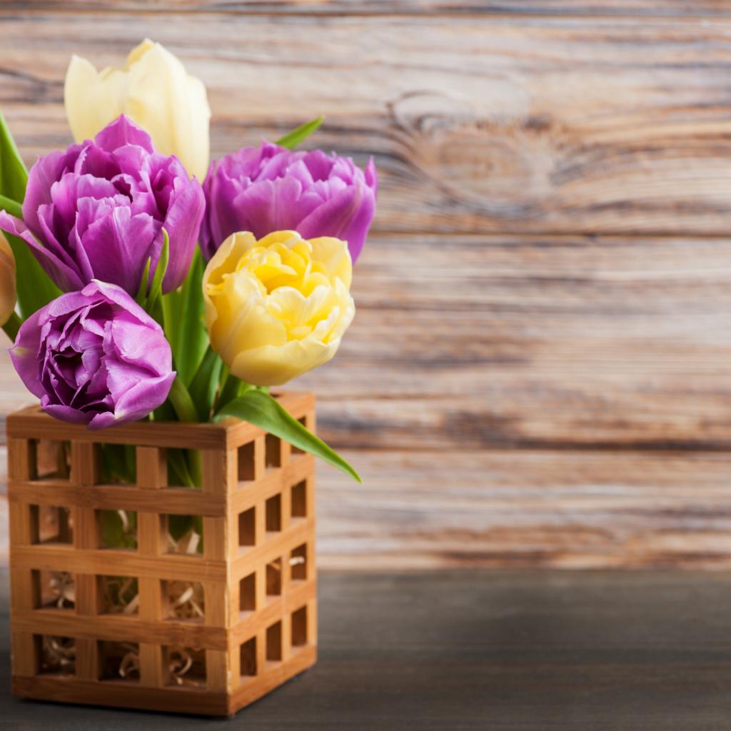 Wallpaper Bouquet of yellow and lilac tulips in a vase