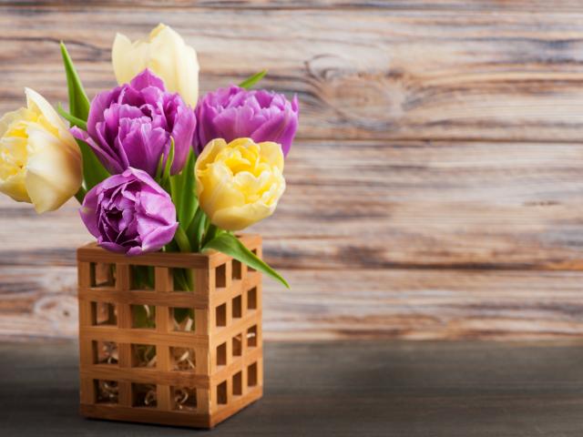 Wallpaper Bouquet of yellow and lilac tulips in a vase