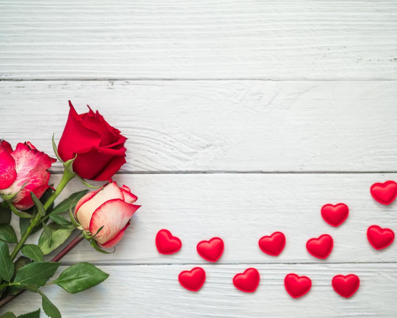 Wallpaper Three fresh roses on a gray table with red hearts