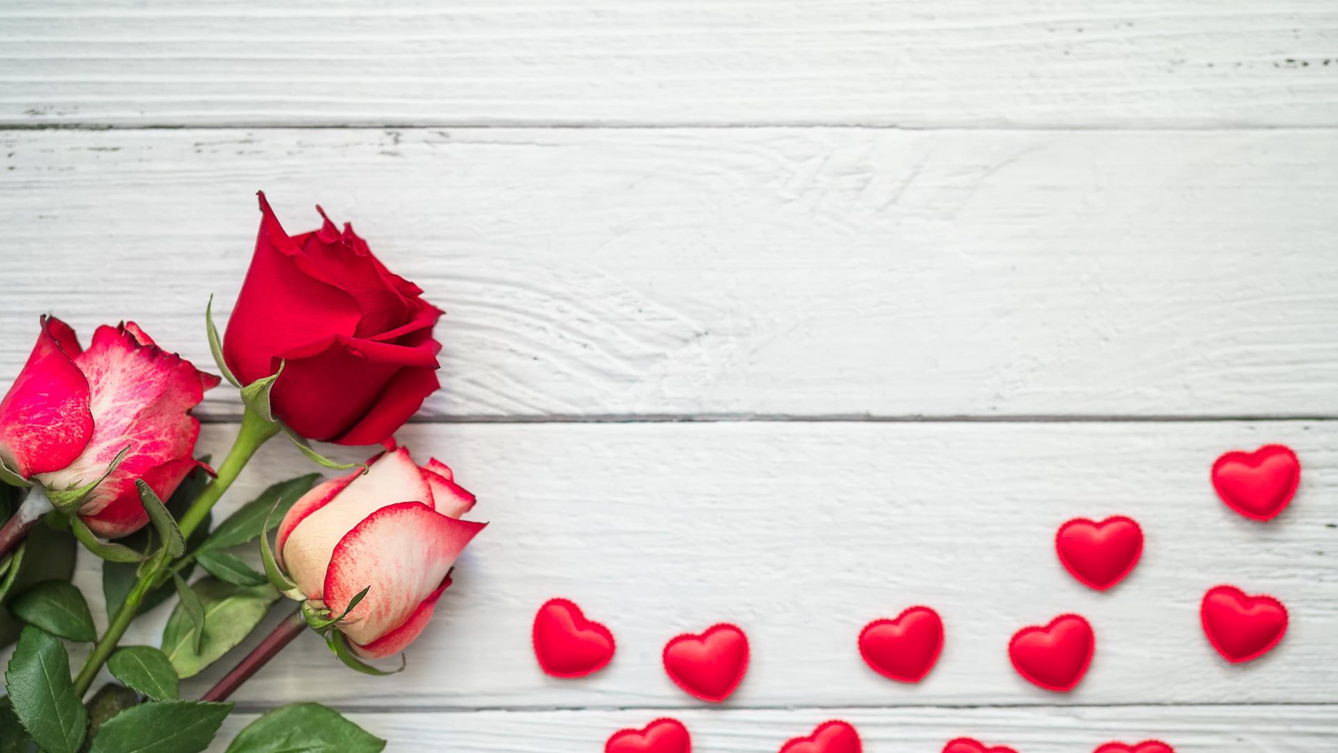 Wallpaper Three fresh roses on a gray table with red hearts