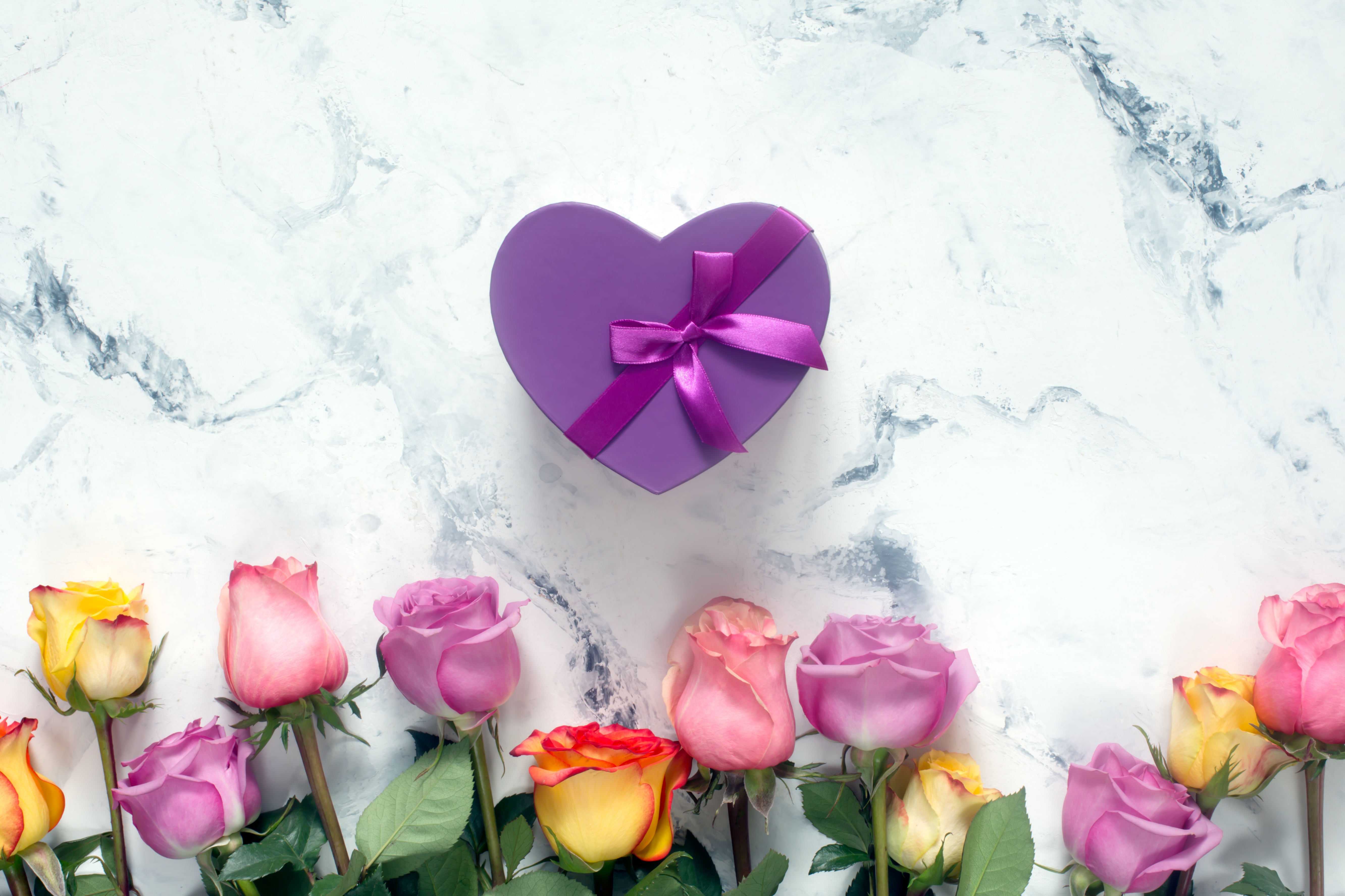 Wallpaper Bouquet of roses with a purple heart-shaped box