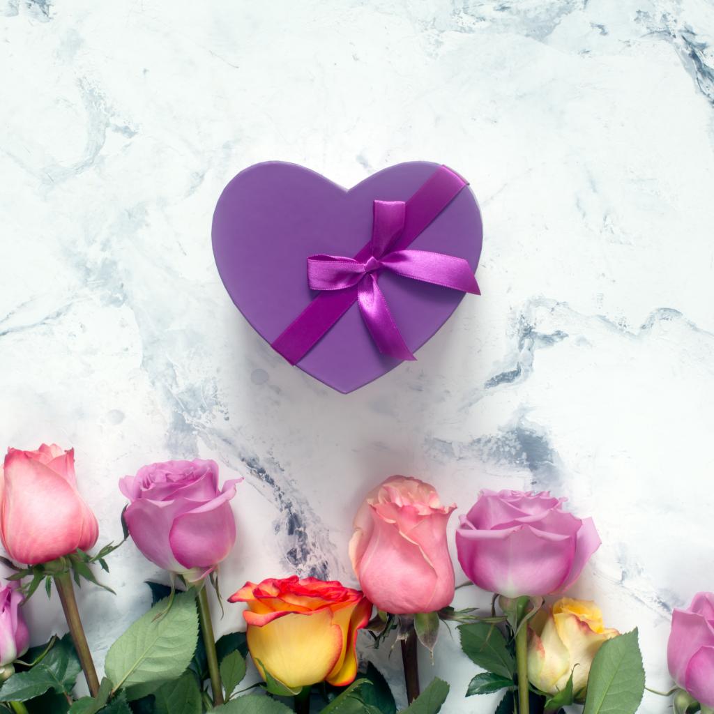 Wallpaper Bouquet of roses with a purple heart-shaped box