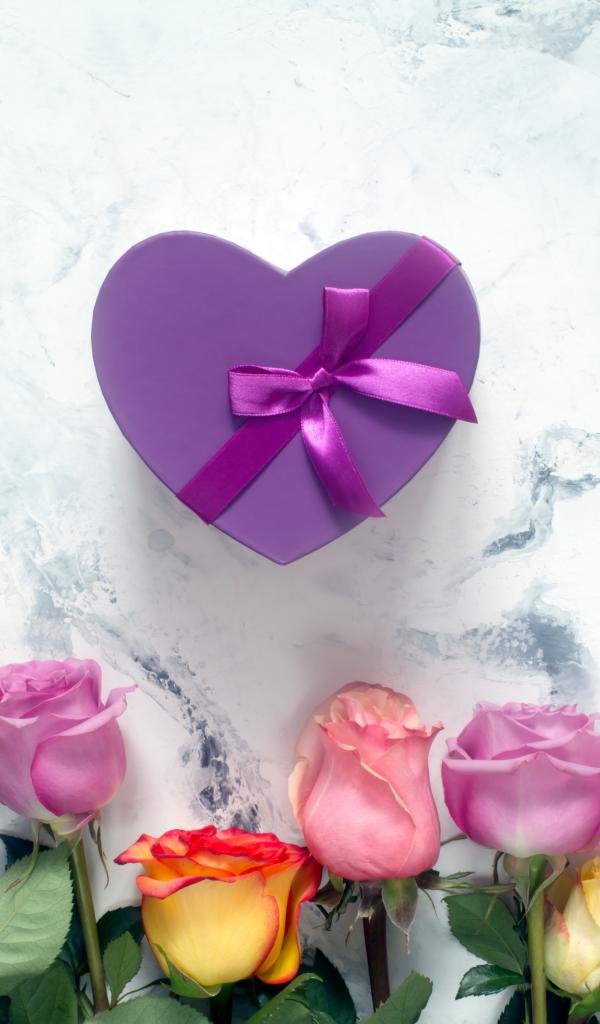 Wallpaper Bouquet of roses with a purple heart-shaped box