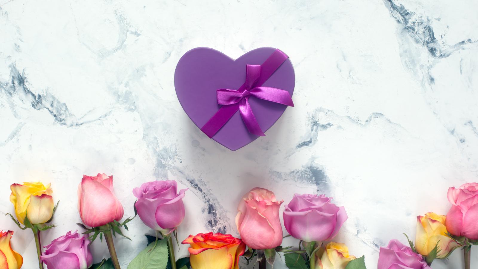 Wallpaper Bouquet of roses with a purple heart-shaped box