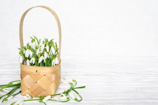 Wallpaper Bouquet of snowdrops in a basket on a white table